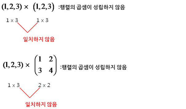 - 앞의 행렬의 열과 뒤의 행렬의 행의 개수가 같아야됨.